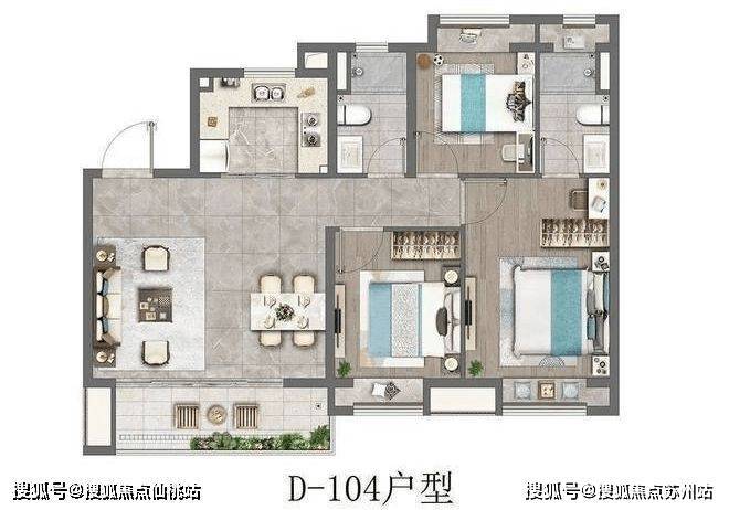 建面约104㎡的3房户型,四开间朝南+主卧套房设计+全卧室带飘窗+南北通透+超大的宽面阳台,做出了拥有120㎡以上户型的尺度感和舒适度。如果预算合适,这个户型绝对推荐。