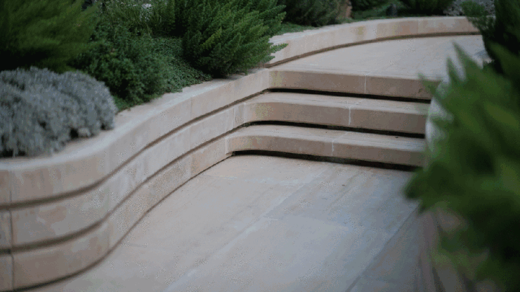 长150米的风雨连廊,使用法国木纹进口石材,“没有做抛光等处理,而是保留了原始的质感”。