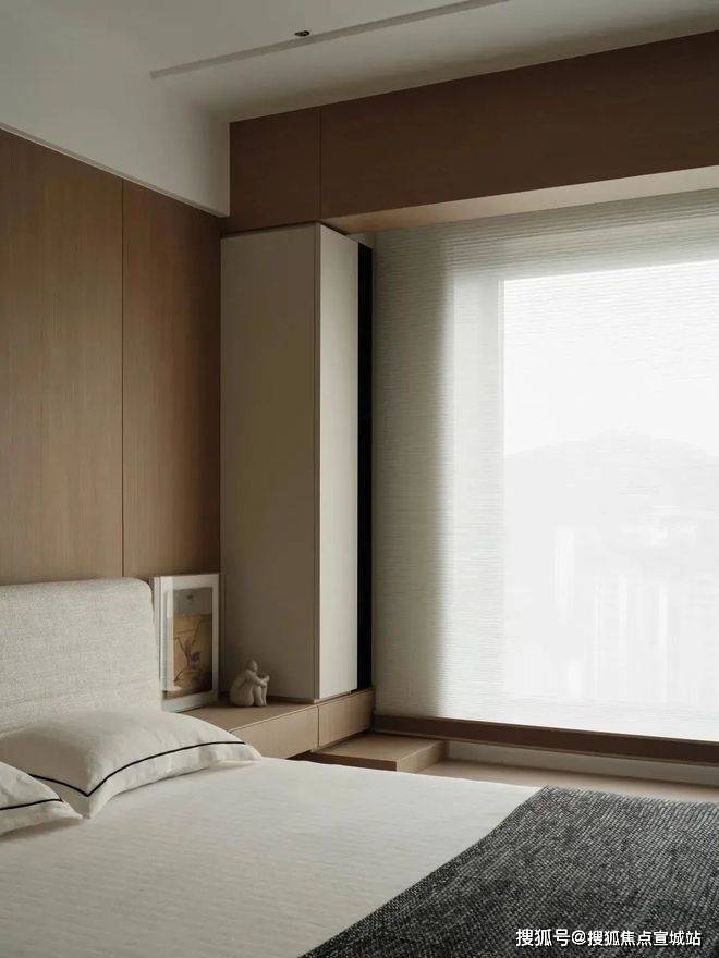 主卧借由落地窗模糊室内外的界限,让自然景观成为生活的一部分。这里不仅是夜晚的休憩地,也是白昼时静思的角落。