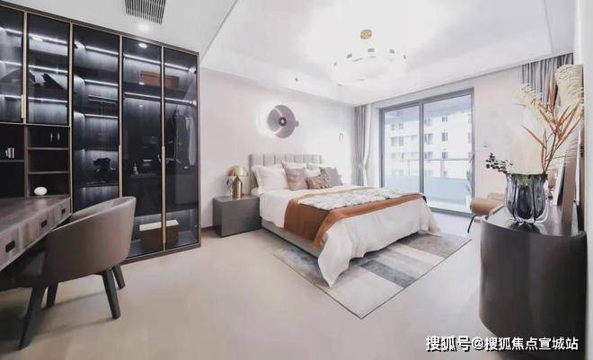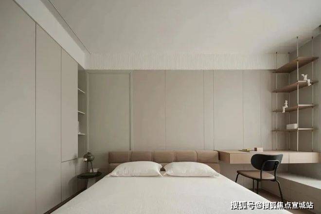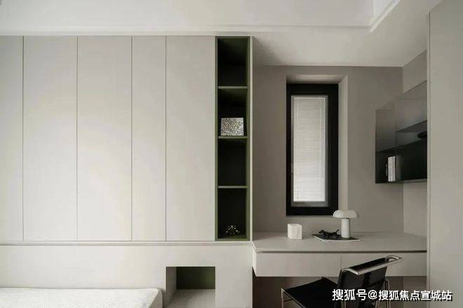 次卧则以功能为导向,通顶柜体与悬浮书桌优化了收纳效率,极简的书柜设计让空间回归干净利落的本质,满足高效生活的需求。