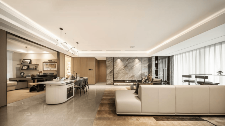 约8.7米双联阳台与约5.6米宽境方厅无缝衔接,融合为LDKB一体化社交公区,通过洄游动线串联各功能区块,让家庭的互动随时发生,陪伴自然生长。