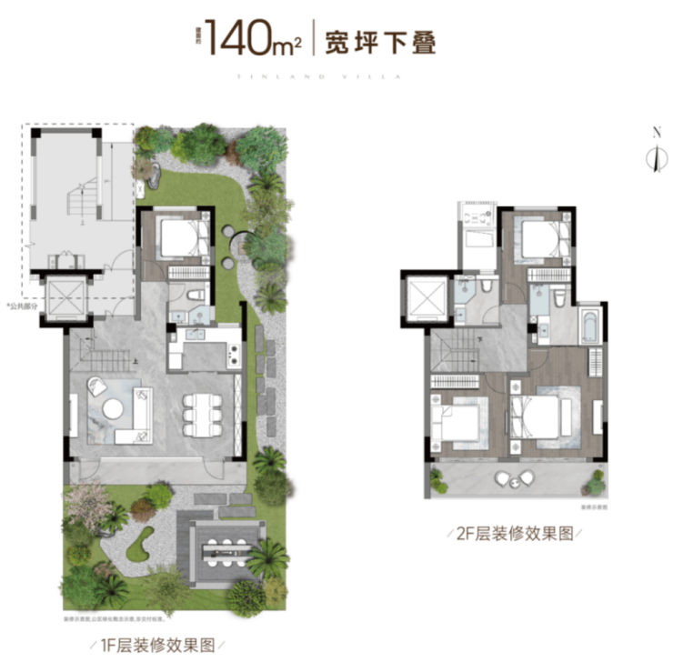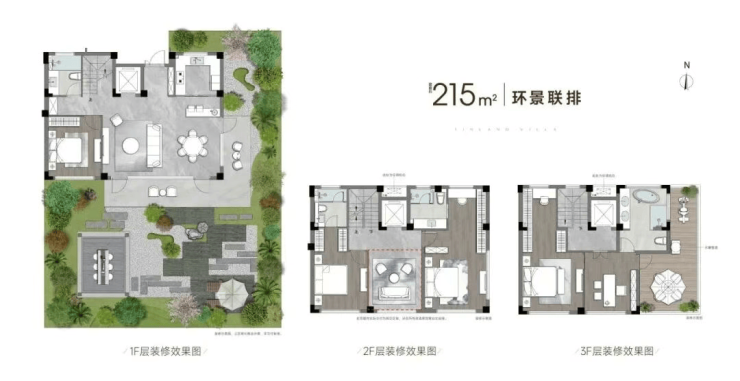 其中下叠产品,充分实现庭院革命,让生活“长”在自然里, 270°三面围合庭院,宅景比例超过1:1。这不再只是“有院子”,而是让庭院成为家庭生活的核心现场。约7.3米南向大横厅搭配全景落地窗,实现室内外交互的无界对话。