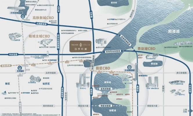 ①四大CBD黄金交汇点:傲踞园区、青剑湖、相城主城、高铁新城四大核芯CBD黄金交汇点,四大板块势能叠加,集城市资源富集度与生态宜居性于一体,成为塔尖人群竞相争藏的价值高地。