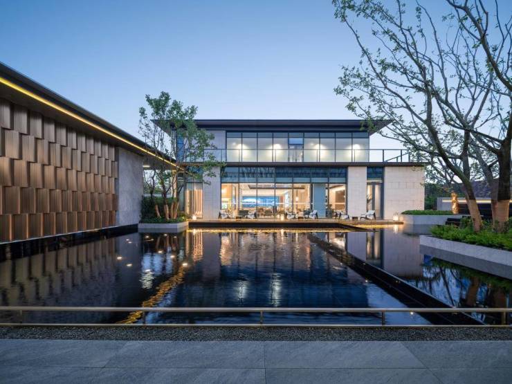 约37米恢弘府门,第一眼气场全开:融合东方礼序与现代线条,用仿石砖、金属格栅与灵动水景,铺就气势十足的归家序幕。