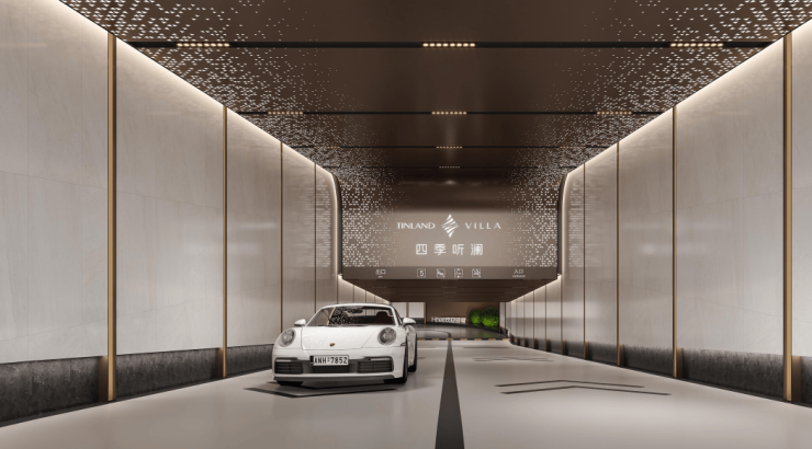 雅奢电梯与高配地库,尊崇感无缝衔接:电梯轿厢内,岩板、皮纹防火板与灰玻勾勒出静谧奢华;地下车库则以高定吊顶、玄关化设计与璀璨灯光,让停车时刻也充满仪式感。