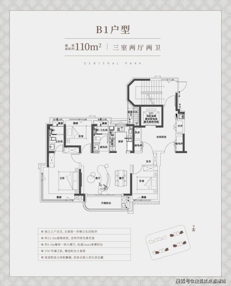 建面约110㎡B1户型,南向面宽也做到了约12.3米,单就这个面宽就秒杀了市面上同类型或同价位段的新盘。