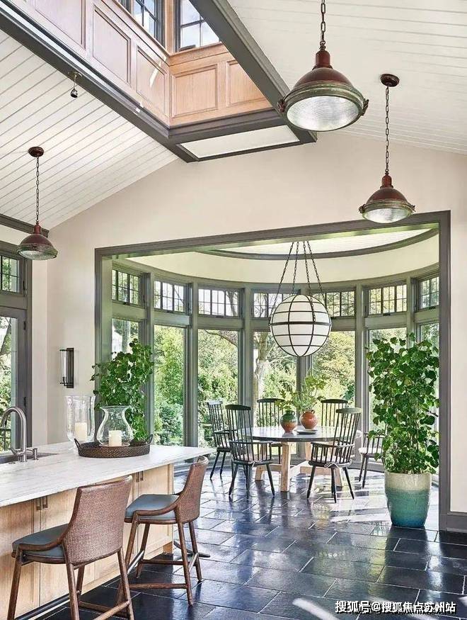 富有纹理的橡木橱柜散发着乡村气息,厨房岛上方的天窗充满了饱和的阳光,屋顶的吊灯灵感来源于工业美学,增强了工作厨房的既视感。