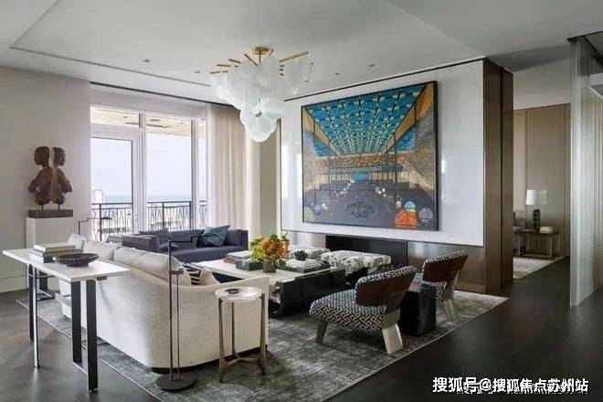 从客厅开始,整个空间都遍布着蓝色的元素,设计师以星座为主题进行设计,搭配上James Thomas的茶几、Holly Hunt的沙发、Minotti的扶手椅和Andrianna Shamaris的边桌,打造既高级又充满梦幻感的居家空间。
