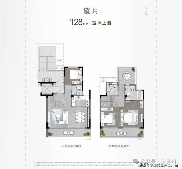 建面约128㎡上叠,3房3卫,带屋顶大露台。