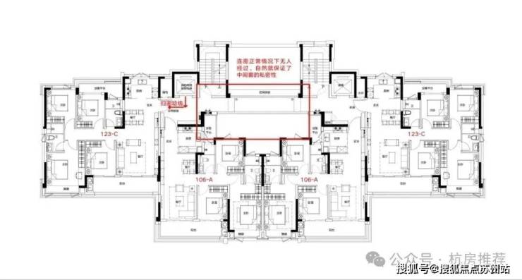 首先这个户型解决了中间套的隐私问题,如上图所示,两个边套回家都不需要经过连廊,所以保证了中间套的私密性。