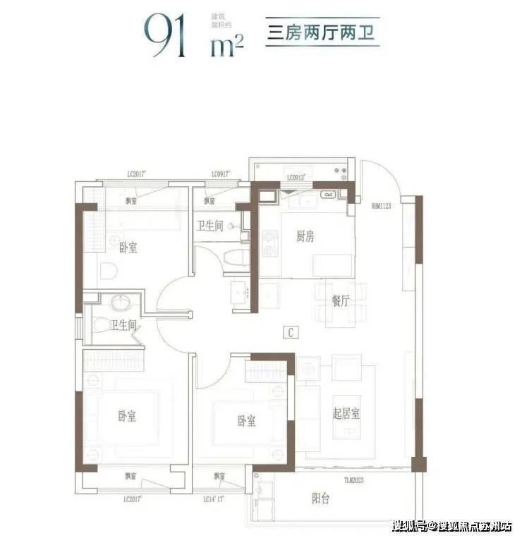 建面约91㎡3房2厅2卫▼