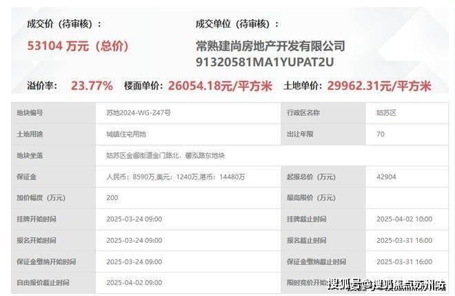 项目地块(苏地2024-WG-Z47号)于2024年4月历经51轮竞拍,最终以总价5.3亿元、楼面价26054元/㎡成交,溢价率高达23.77%。建发璟园售楼处营销中心:400-8828-814建发璟园售楼处电话/地址☎:400-882-8814(开发商热线)
