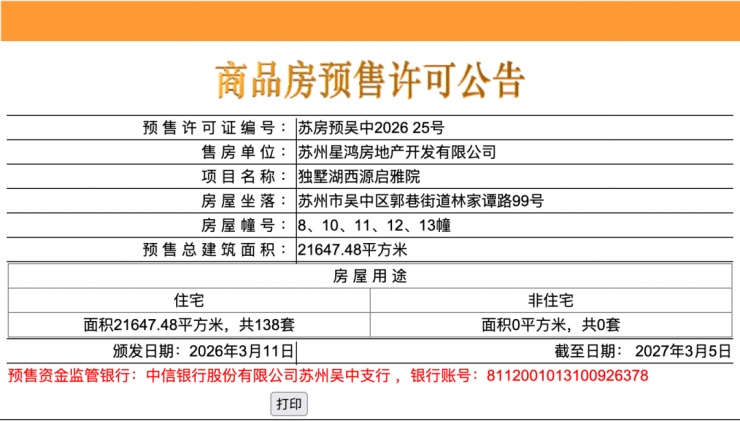 刚刚,苏州独墅湖西低密项目——湖西源启首次取证,房源共计138套。