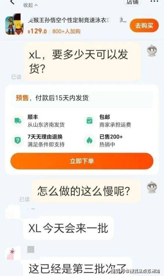 7月10日,经视直播记者联系几位商家,他们网上回复称,泳衣就是模仿孙悟空设计的,因为销量太火,所以只能预售。还有商家称,已经从厂里拿到第三批货了。