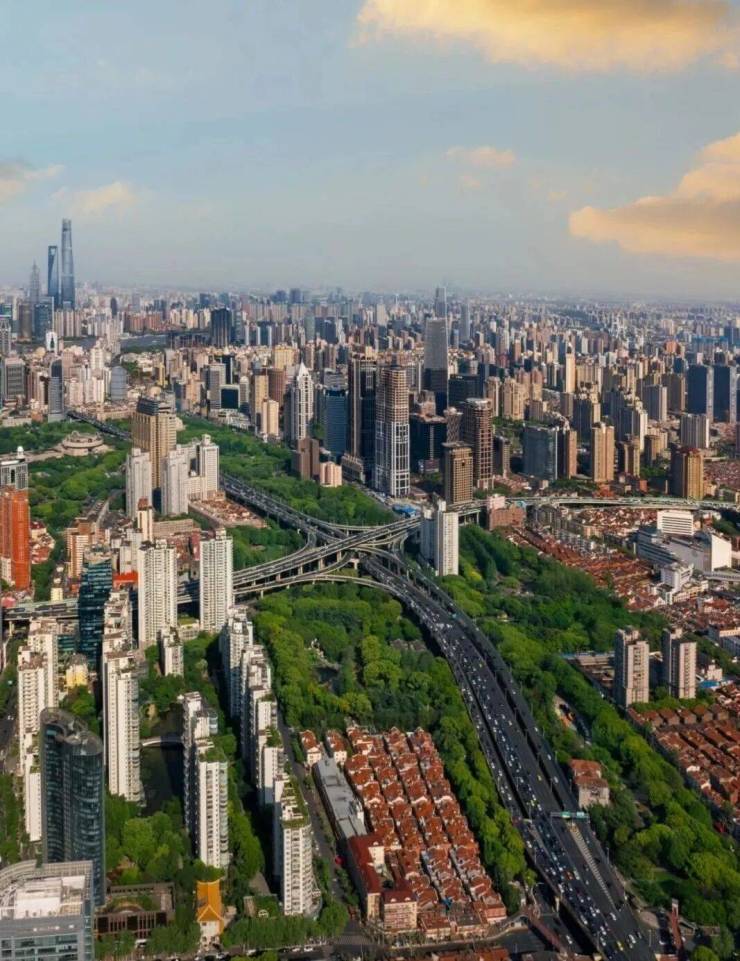 东瞰:延中绿地公园、新天地、陆家嘴“三件套”;