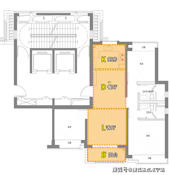 户型内部设计整体非常方正,KDLB一体化设计,形成超尺度公共社交场域,南北通透。