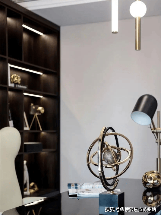 茶几上摆放着黄色金属的工艺品,通过材质的造型和线条,让空间显得更有设计感,同时也凸显出空间主人的精致和时尚。