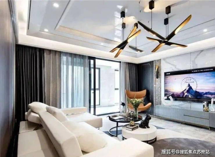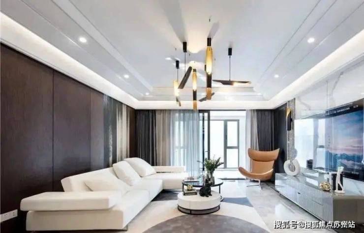 客厅设计简洁明亮,通透大气。无主灯的吊顶,结合白色的家具,上下呼应,和谐统一。深色的背景墙,给空间注入了一股摩登的氛围,造型独特的吊灯,彰显个性的空间氛围。