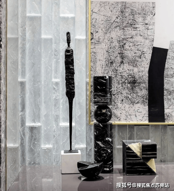 大理石的背景墙和金属线条元素相互搭配,营造空间的大气轻奢质感。灰色的色调,表现出复古优雅的空间氛围。