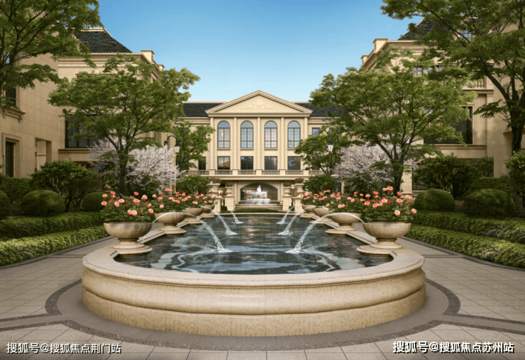整个园区,以经典的绿城法式墅区景观大中轴贯穿,占地约1000多㎡,联排建筑的设计,融合了中国传统院落布局与法国枫丹白露宫的审美,外立面大面积采用全石材干挂,檐口等细节部位使用仿石。