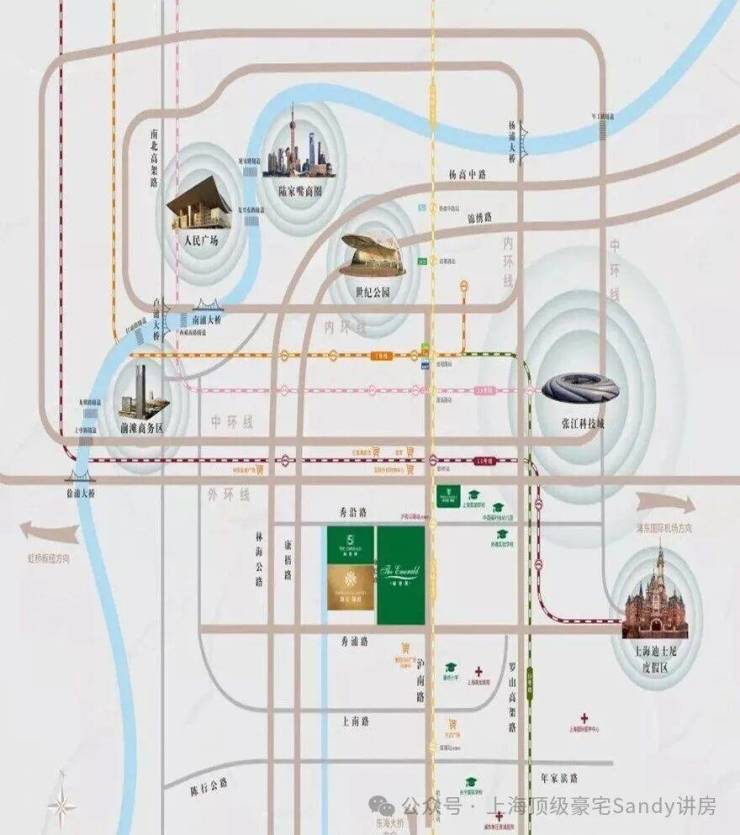 小区位于康桥板块,东接迪士尼国际旅游度假区,北接联洋世纪公园,距离陆家嘴约12公里。并且凭借区域内的中环线、S20 、地铁18 、11号线等道路交通设施。把康桥和前滩、张江科学城、迪土尼、浦东国际空港、外高桥自由贸易区等五大引擎连成一条黄金轴线。总结来说,这里属于浦东的交通要塞,拥有十分重要的战略意义。