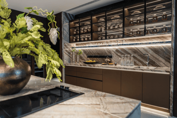 西厨吧台更是匹配了符合空间调性的东方木纹与龙飞凤舞石材,独特的纹理和质感提升了厨房品质与艺术性.