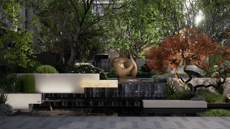 ● 中心高定花园:名贵石材与流水景致相映,四季风景如画。