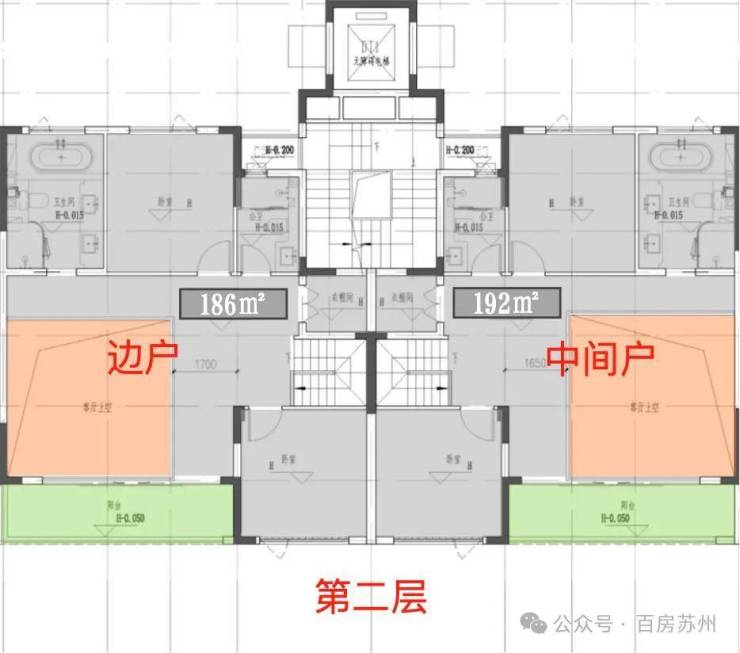 下叠186㎡(边户)/192㎡(中间户),南北双庭院,一层带老人房,送地下室。二层挑空可改造,整体得房率约88%。