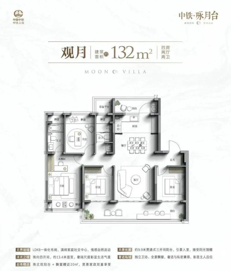 东边户164㎡更狠,270°角厅、LDKG一体化,16米多的南向面宽,客厅横着走。得房率85%(含赠送),在洋房算顶尖了。
