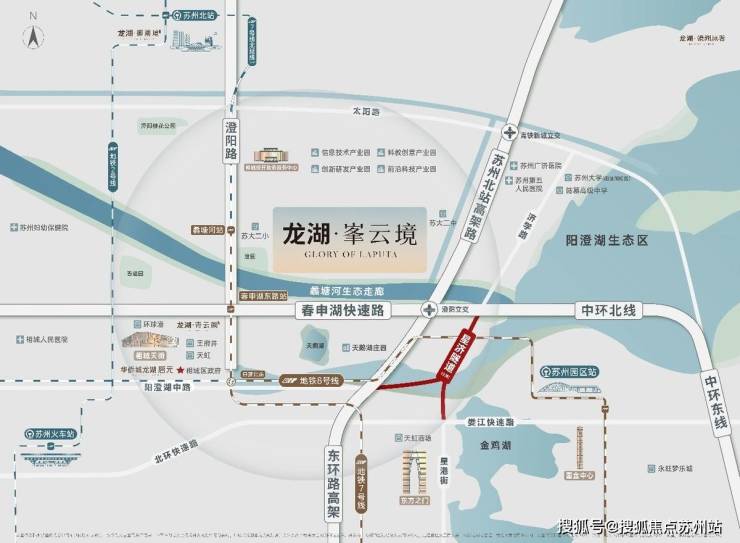 交通上,「双轨双环一隧」立体路网已然成型,直线距离约3公里内覆盖在建地铁 7 号线(在建)、8 号线,中环北线与苏州北站高架路快速通达,阳澄湖星济隧道(在建)将实现「飞虹贯湖」。未来4站即达苏州北站,6 站直抵工业园区,「黄金效率」让全城通勤从容切换。