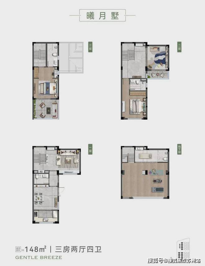 以约148㎡合院为例,其南向空间足够方正,不被割裂。L型设计将空间聚集到一处,无论在一楼的客厅,还是在二楼的卧室,乃至在三楼的露台,俯仰之间皆是风景。