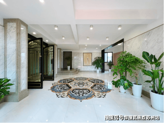 每栋楼也都是地上地下双入户大堂的设计,一层入户大堂地面采用了曼陀罗拼花造型,而且都是纯手工切割技术打造的定制款,造价颇高。