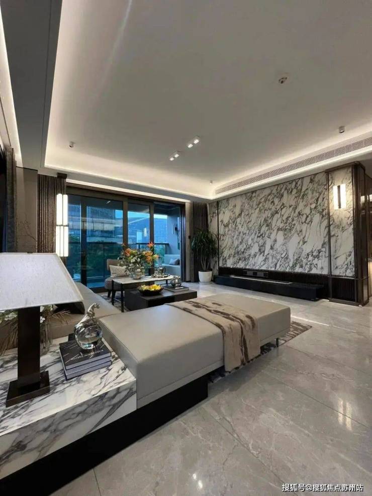客厅背景墙用的是天然宝格丽大理石做成的,奢华大气!无主灯的设计尽可能的保留了原有的层高,使得客厅的空间感更好,显得更大