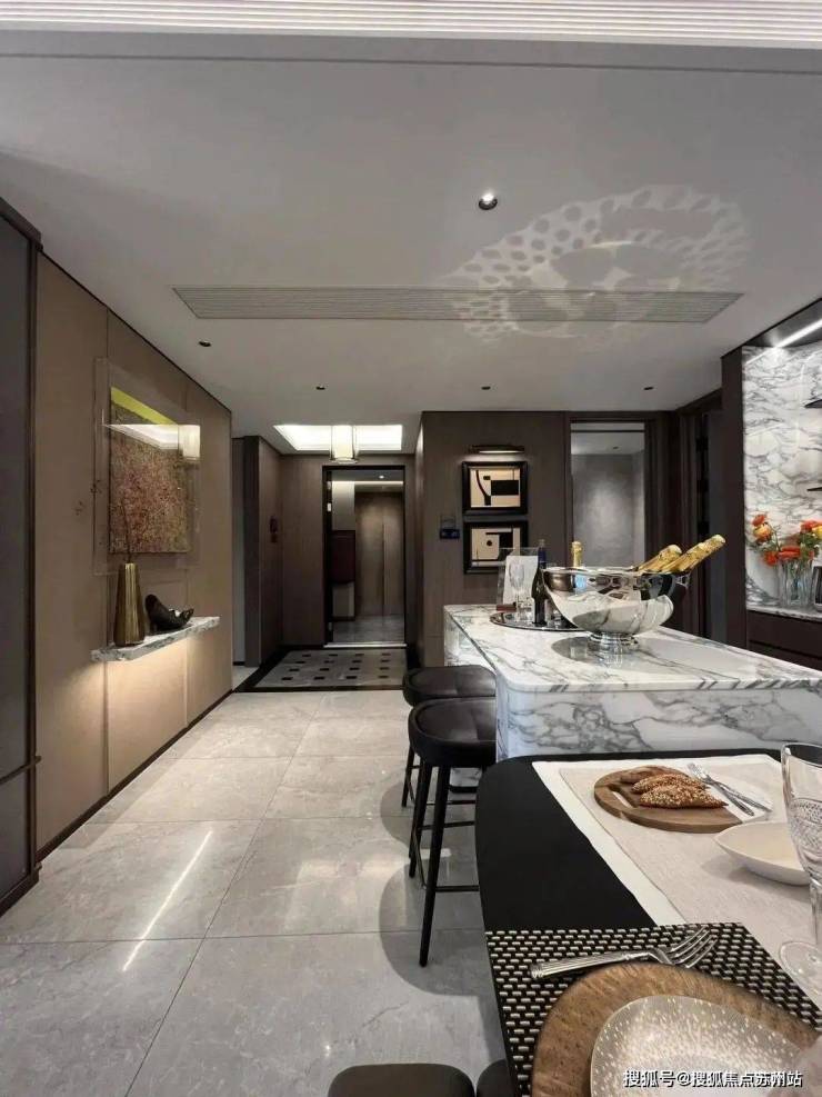 奢石岛台和餐边柜搭配实木餐桌,天然石材的质感和实木餐桌的温馨并存