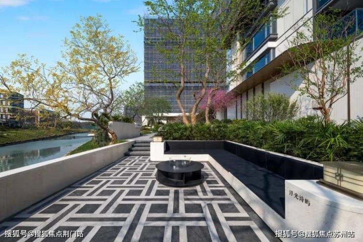很多楼盘水池铺的都是瓷砖马赛克, 但它却用上了意大利卡拉卡白大理石,将池水衬出梦幻的蒂芙尼蓝。池边摇曳着油橄榄树、造型紫薇,高级感丝毫不逊现在那几个网红豪宅。