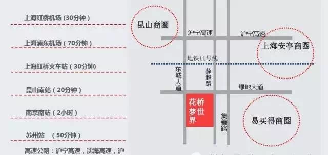 花桥梦世界毗邻三大商圈——昆山商圈、上海安亭商圈、易买得商圈,到昆山南站只需20分钟,30分钟即可到达上海虹桥,地理位置得天独厚!