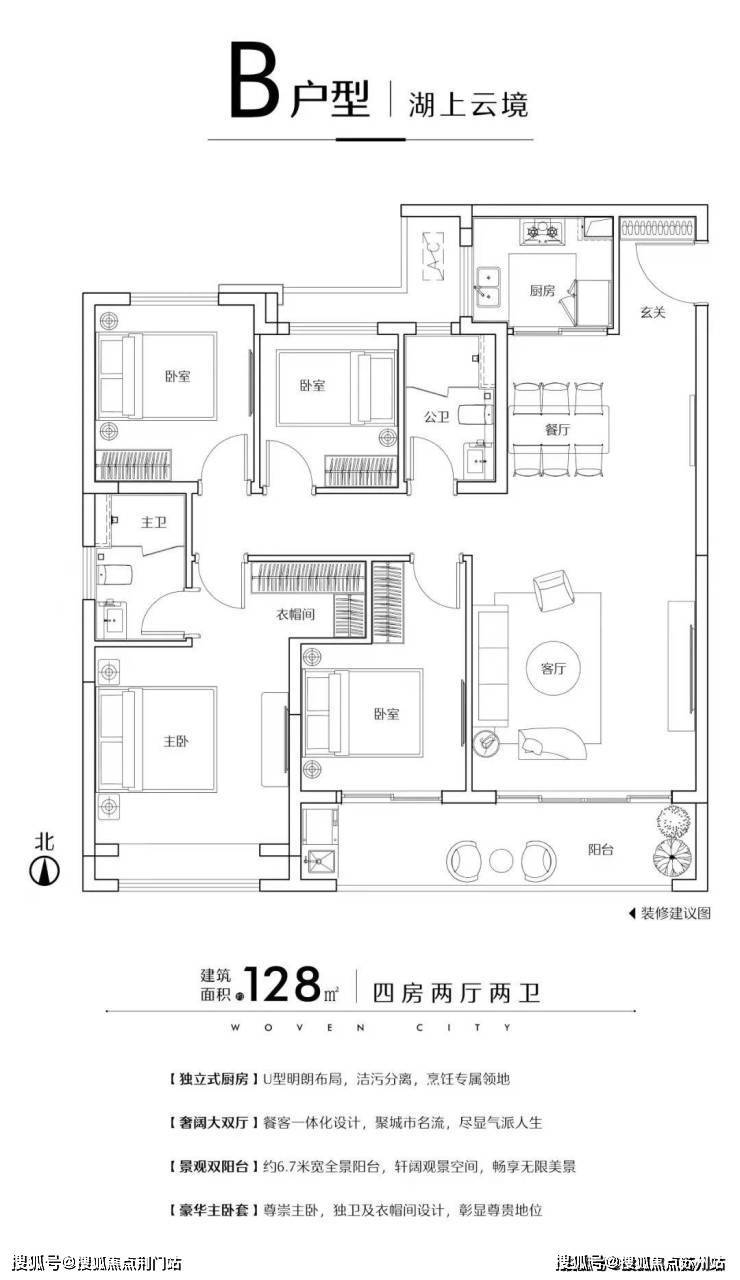 以建筑面积约139㎡为例:“四叶草”设计,让四个卧室格局独立,每位家庭成员都可以享受到无比舒适的起居尺度和私密生活;客餐厅一体化设计,集合了欢聚时光与亲密关系,营造出开放的互动场景;与宽厅自由接洽的跑道式阳台,更打破了空间界限,迎纳风景与阳光入室。