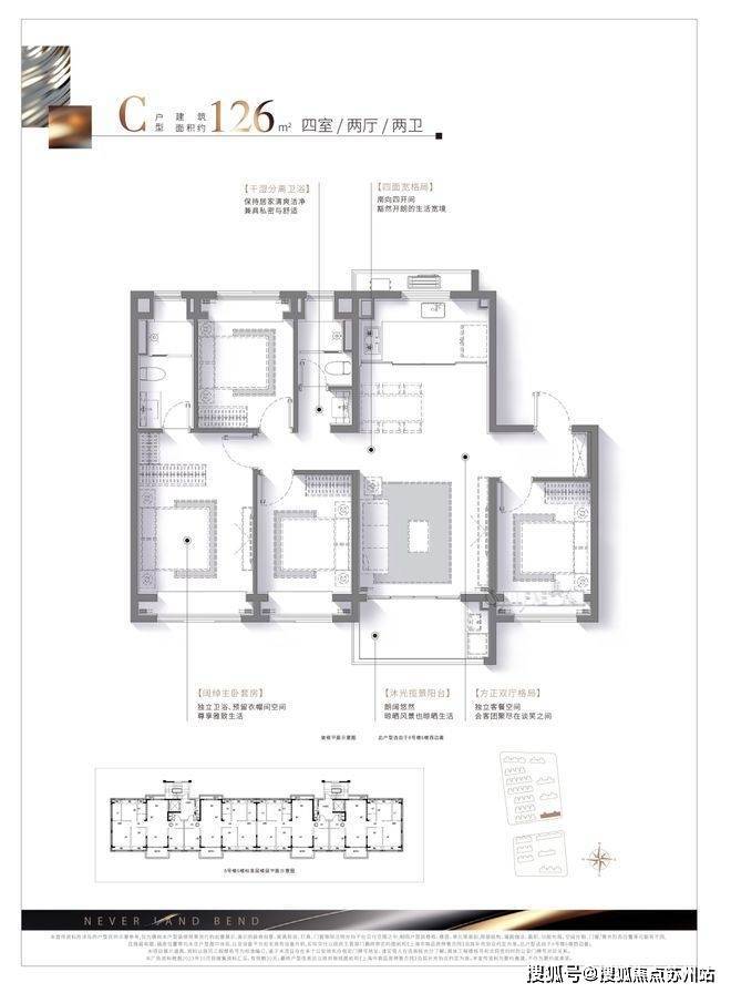 建面约126㎡真四房,进一步强化功能性,招商云澜湾售楼处电话:400-8787-554户型方正,四开间朝南,南北通透,南向卧室均带有大飘窗设计,拓宽了室内景观视野的同时,增加了实际空间使用率,有效避免面积浪费。