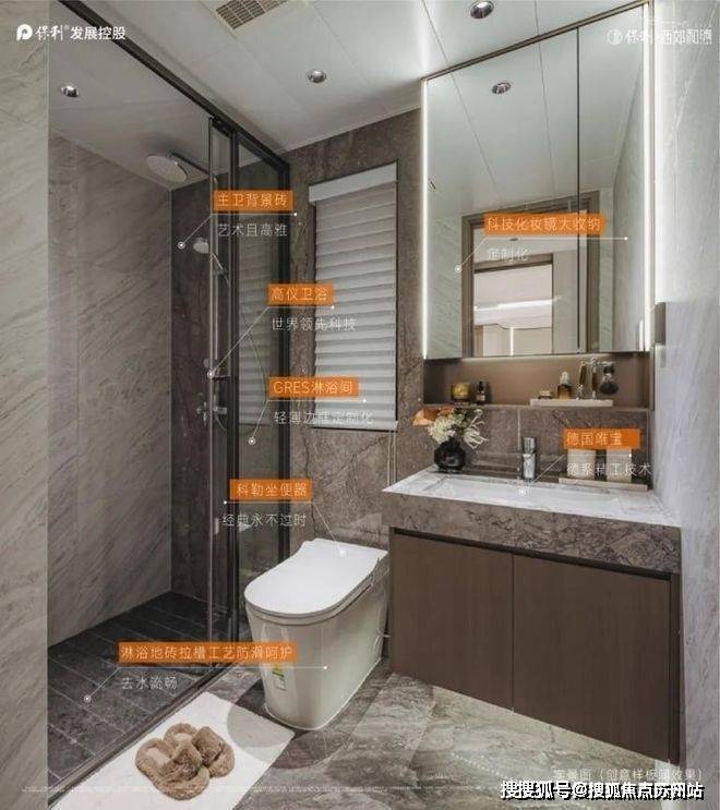 保利西郊和煦售楼处电话: 400-8787-554卫生间浴室配备品质4件套,同时置物架/镜柜/去水槽等匠心设计,也将卫浴间的精致拉满。