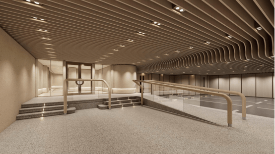B2层大堂以浅色岩板巧妙包覆,细腻的纹理与柔和的色调交织,营造出庄重而不失优雅的仪式感。