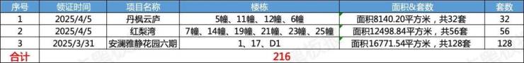 1、4月5日,丹枫云庐,新取证32套,分别位于5幢、11幢、12幢、6幢,主要为叠墅产品,均价约40547元/㎡。