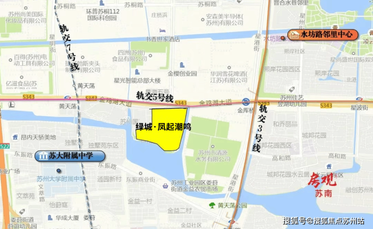 地块周边 3、5、7号线三轨交汇,3站即达苏州中心,北侧紧邻金鸡湖大道,往西直通古城、往东直达湖东。