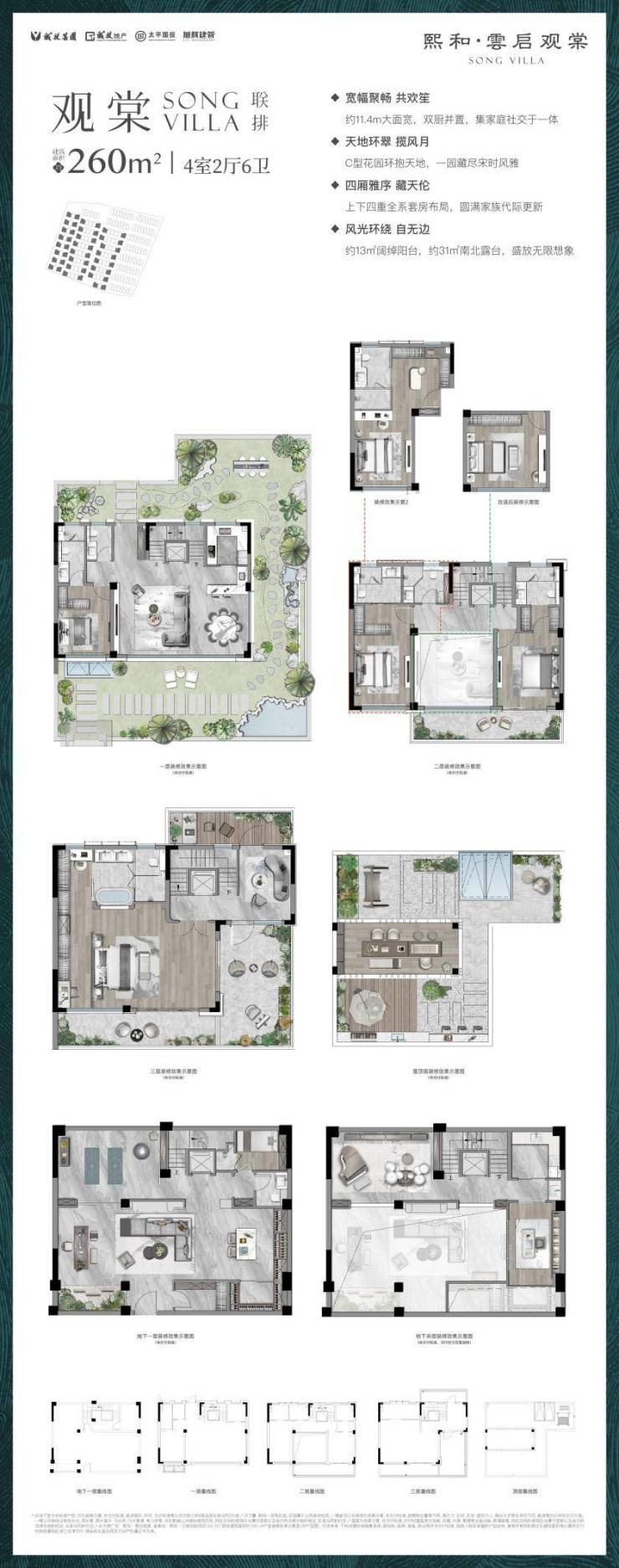 联排边户(约260㎡):地上3层+地下1层,面宽超11米,非常气派。地下室挑高约5米,可自由发挥。总共5房6卫,且每个卫生间都有窗。赠送的花园、阳台、露台面积很大,屋顶还预留了阳光房框架,拓展空间巨大。这款联排别墅户型,充分展现了宋式美学别墅的宽敞与气度。
