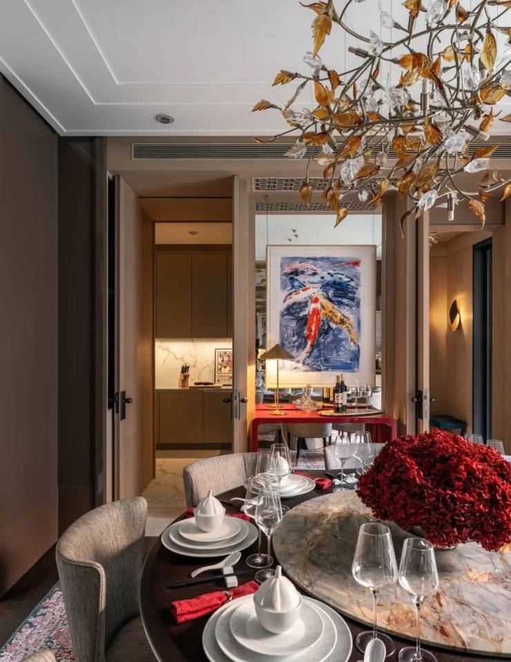 以约160㎡单层空间承载家庭生活的仪式感,约60㎡客餐厅贯通休闲阳台,空间通透、气度非凡。全套房设计,保证每位居者的私密与舒适,礼序有致、功能齐备。