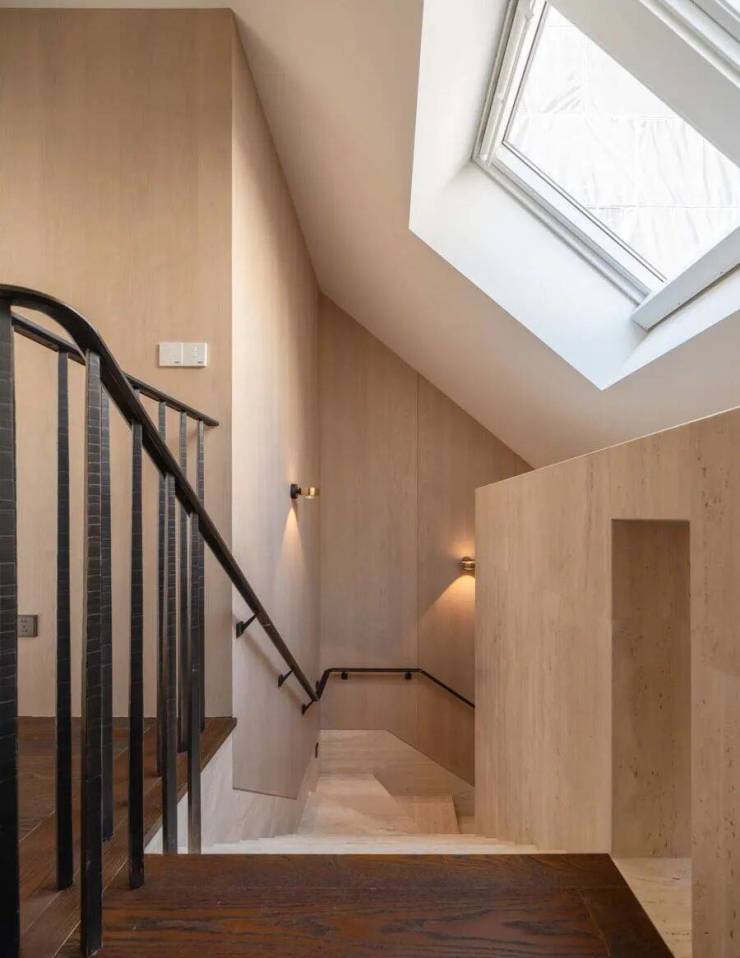 一面贯穿地下室至阁楼七层的整体白色洞石墙体构成建筑主轴。楼梯采用纯净简约的设计,作为连接整个住宅的核心元素,与每层的风格相得益彰。