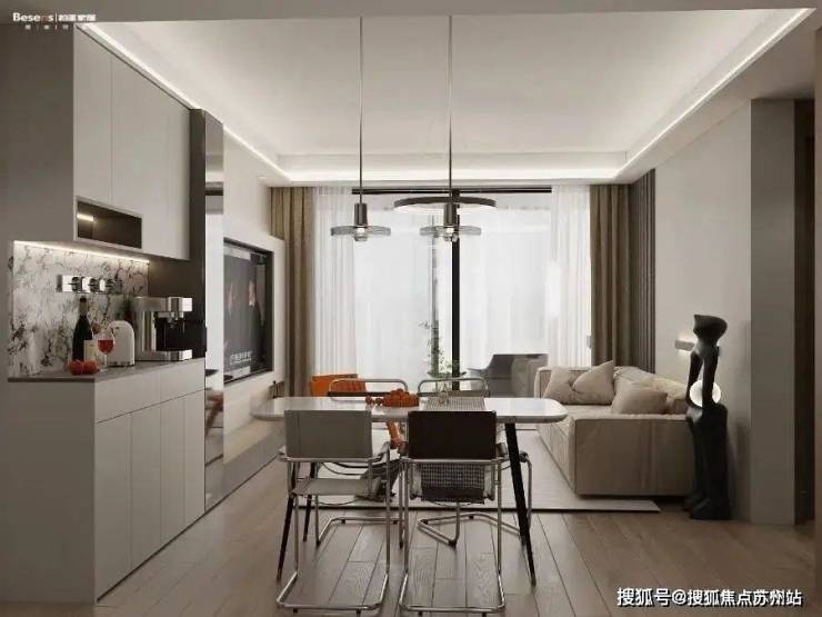 客餐厅贯通一体,视野通透,让整个空间都明亮有加,搭配一张1.4米的大理石餐桌,石材不仅美观,还赋予了空间一种惬意和静谧的感觉。餐边柜中空做轨道插座,可以放早餐机和咖啡机,满足家用小电器的使用。木饰面用深灰色,搭配软装,提升氛围感,结合灯具,呈现出温馨家的感觉。