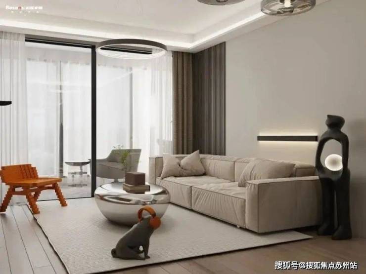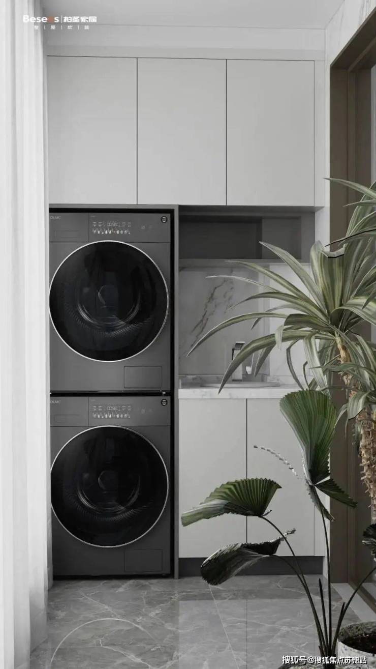 阳台为双阳台设计,靠近南次卧为洗衣机柜,设计了上下叠放,洗烘一体,边上还有水槽,方便手洗小衣物。对面放张懒人沙发和边几,休息天晒晒太阳,喝个下午茶,很是惬意。
