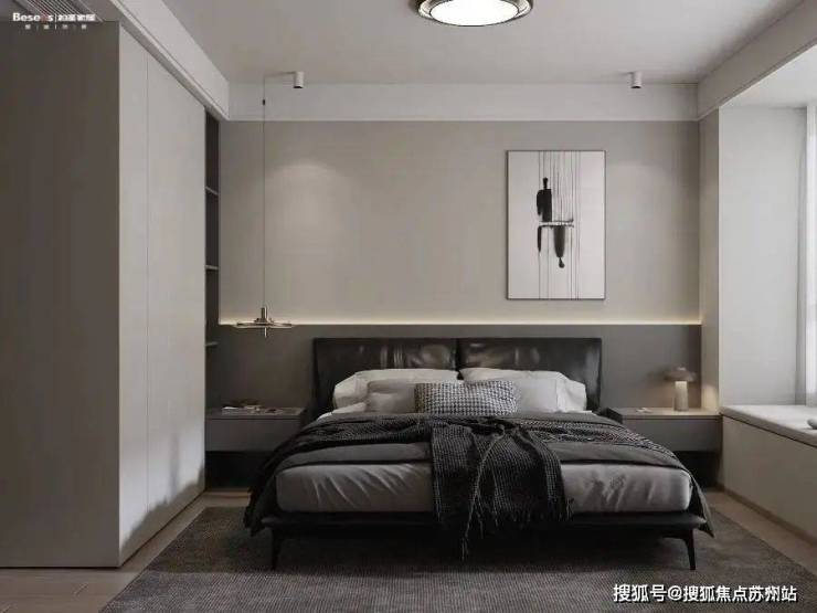 主卧空间设计,2.4米大衣柜 做延伸床头柜 搭配深色床头护墙板,加入灯带设计,增加卧室层次,悬空床头柜设计使空间更有延伸感 简约风格的床品、优雅 的窗帘,搭配柔软的地毯和靠垫,营造舒适的睡眠氛围。