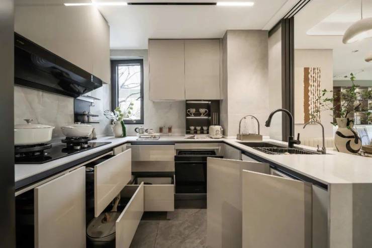 厨房定制的上柜、下柜配齐了从碗筷到厨具所有的收纳空间