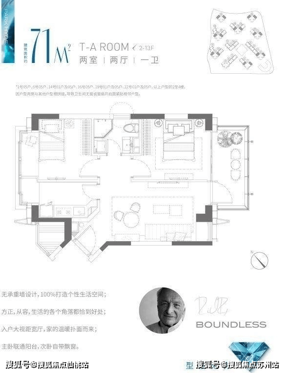 建筑面积约71㎡2房,是项目的热销户型。卧室空间尺度开阔,超大阳台和飘窗台设计,使得实际空间使用率更佳。明厨明卫(4楼以上),提升购房者的居住体验。